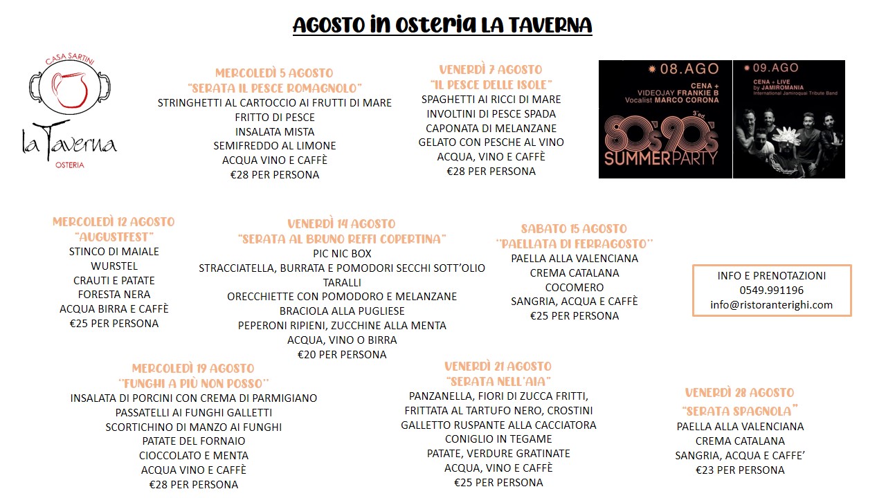 Non perderti le serate dell’Osteria La Taverna del mese di Agosto, ti aspettiamo!