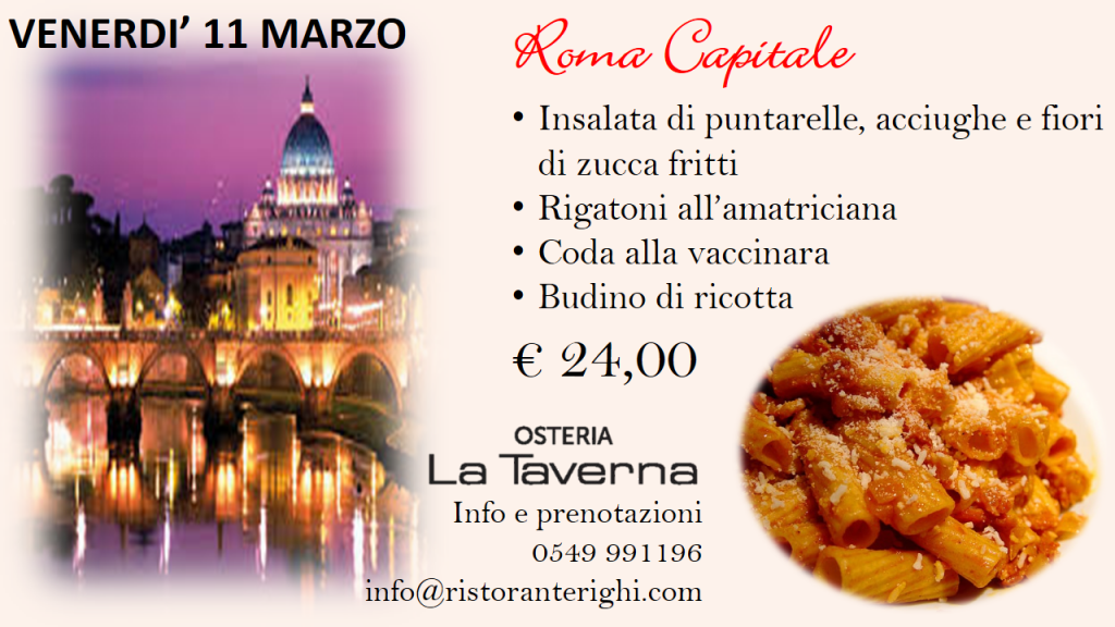 Torna puntuale l'appuntamento del Venerdì all'Osteria La Taverna. Questa settimana protagonista della serata è Roma Capitale, e con lei...