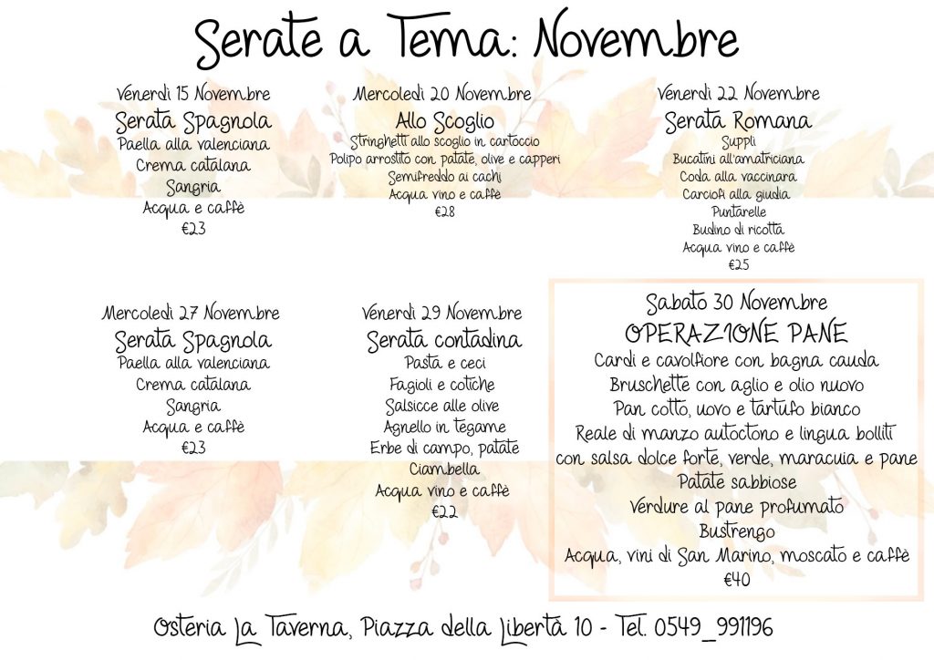 Eccoci a presentare le serate a tema del mese di Novembre de L’Osteria La Taverna !Venerdì 15 Novembre – Serata Spagnola Paella al...