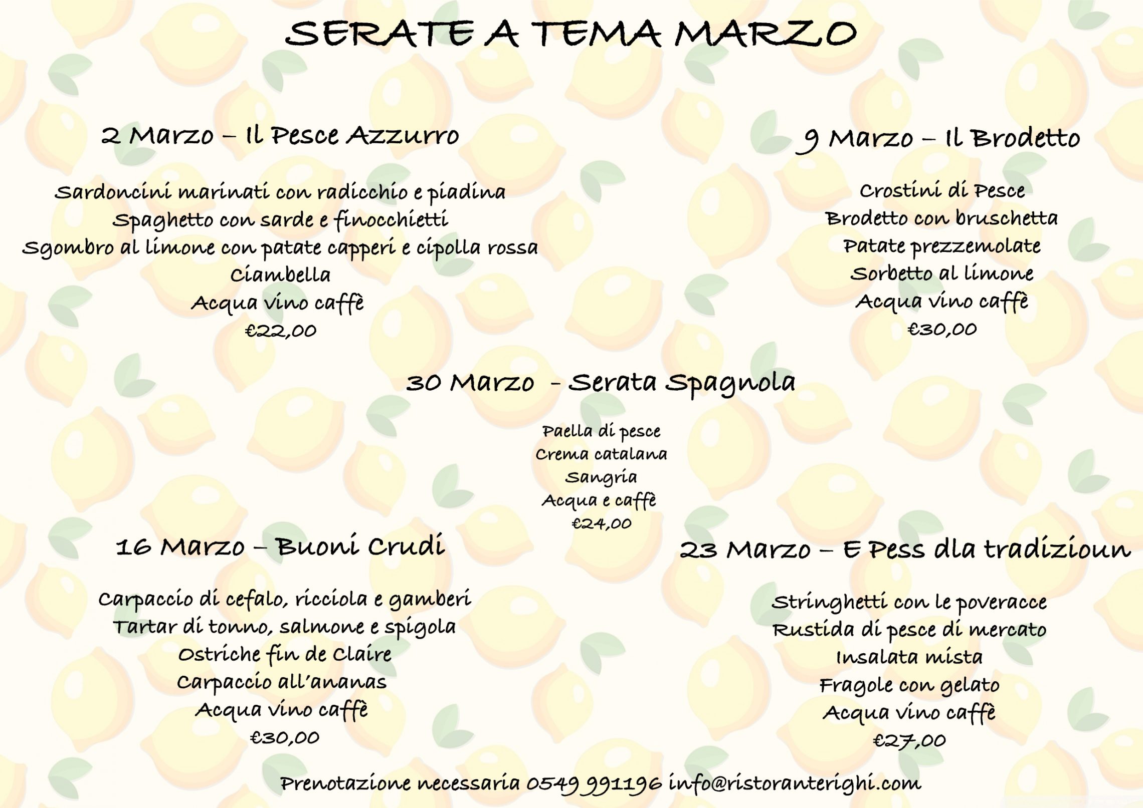 La prima serata sarà venerdì 2 Marzo e sarà a tema “pesce azzurro“, potrete gustare: