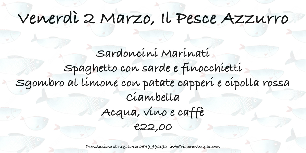 La prima serata a tema del mese di Marzo sarà all’insegna del pesce azzurro, ecco il menu proposto: