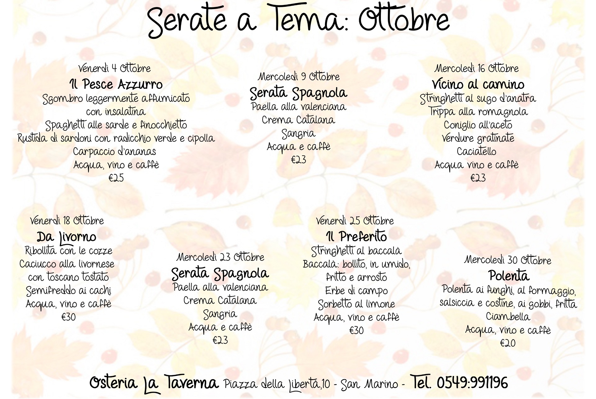 Eccoci a presentare le serate a tema del mese di Ottobre de L’Osteria La Taverna !